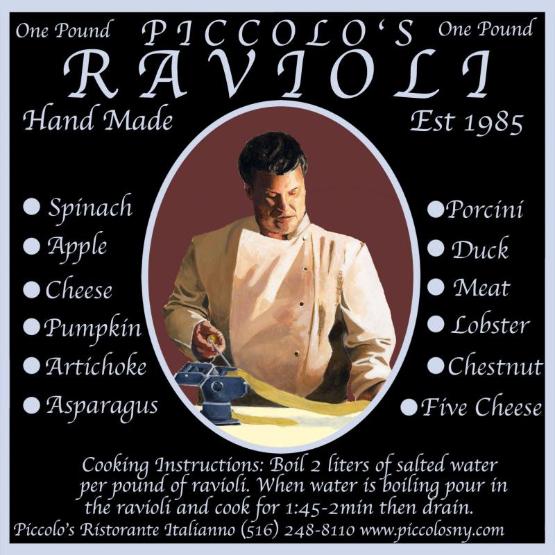 Piccolo's hand made ravioli are made with 100% all natural ingredients and are hand made from start to finish. They are delicately prepared with a home made pasta that is so thin the cooking time is under 2 minutes, perfect for a quick but healthy meal. Our raviolis are also smaller than average because with increased surface area exposed to the heat of the boiling water the cook time is cut in half which is why the pasta can be paper thin. This can only be accomplished by making each one by hand, unlike all the other machine made thick pasta varieties out on the market.